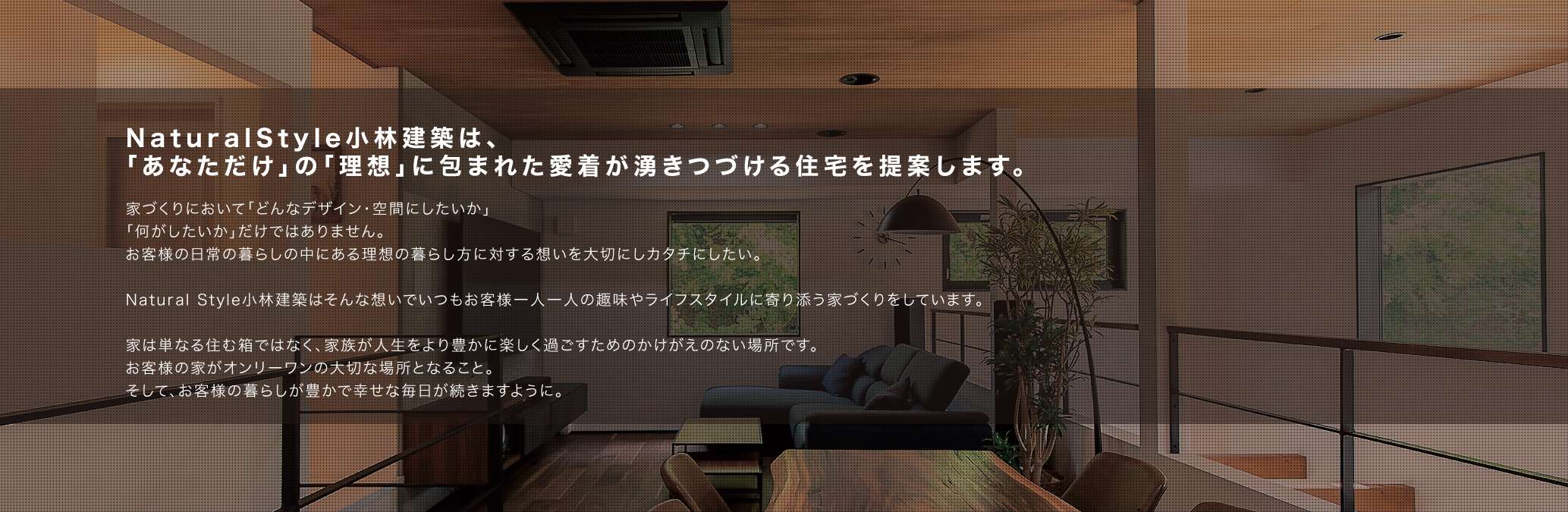 Naturalstyle小林建築株式会社の代名詞ともいえる人気ナンバーワンのSTYLE。無垢材や自然素材を活用した予算内で叶えられる注文住宅を実現。