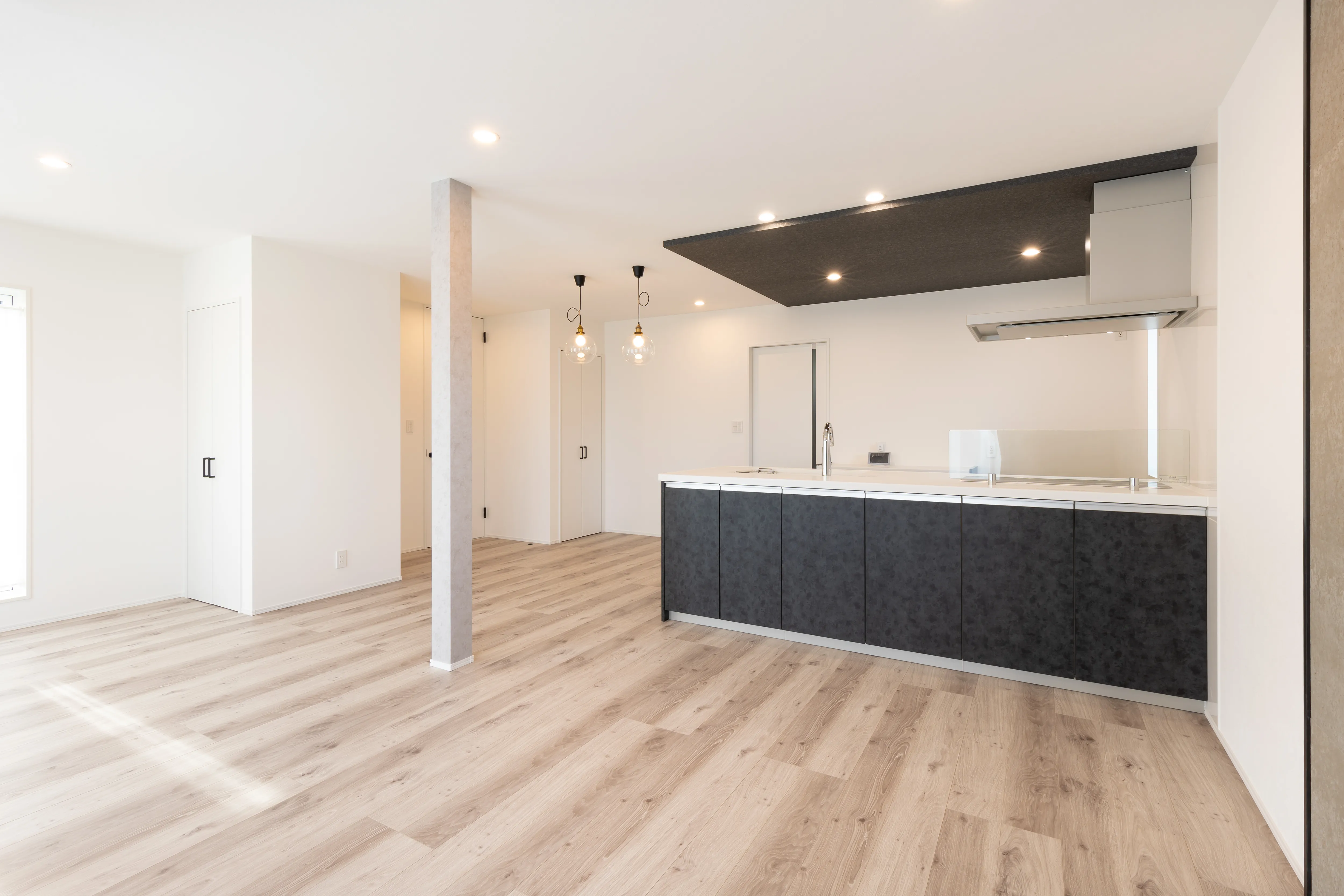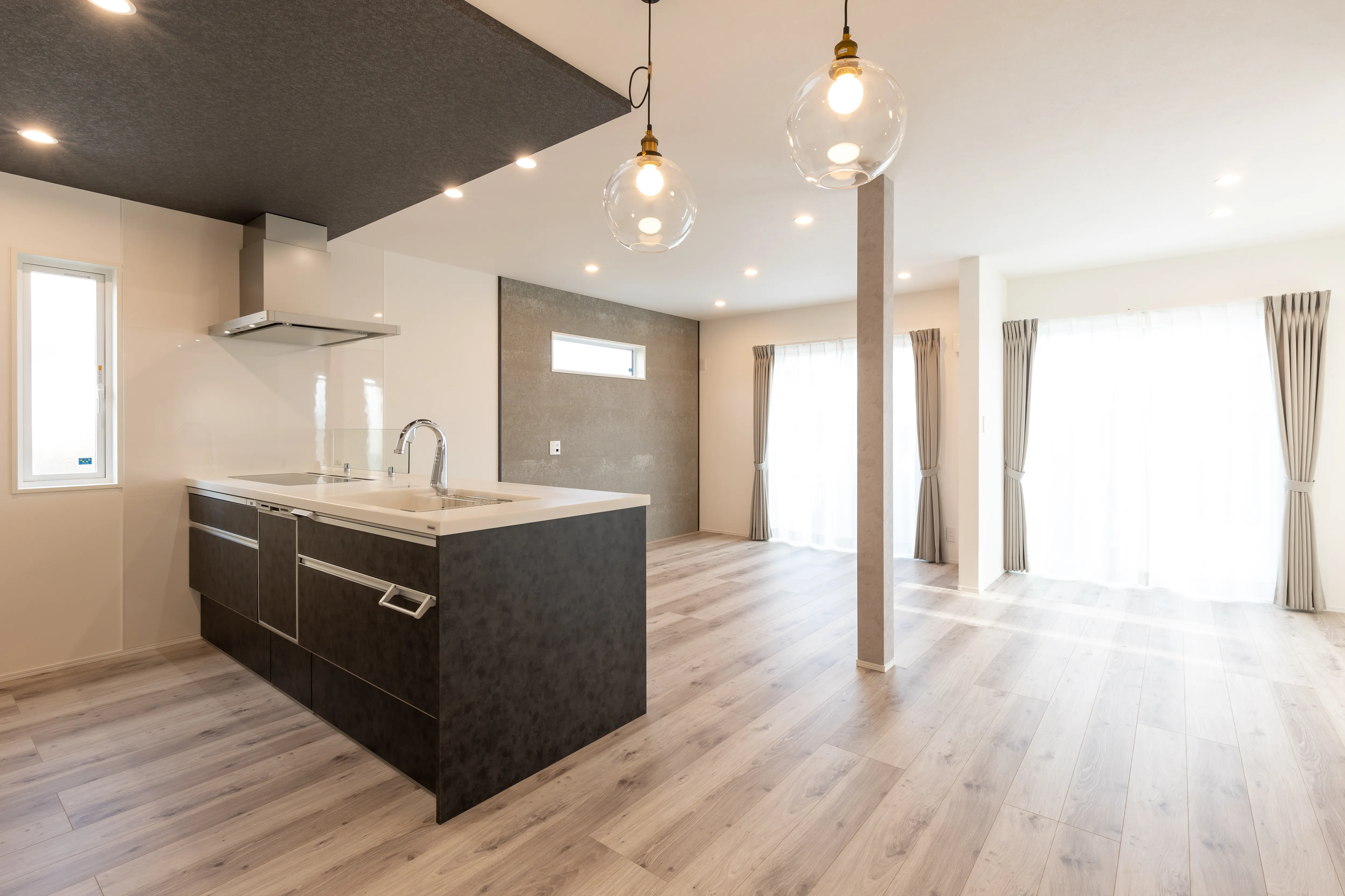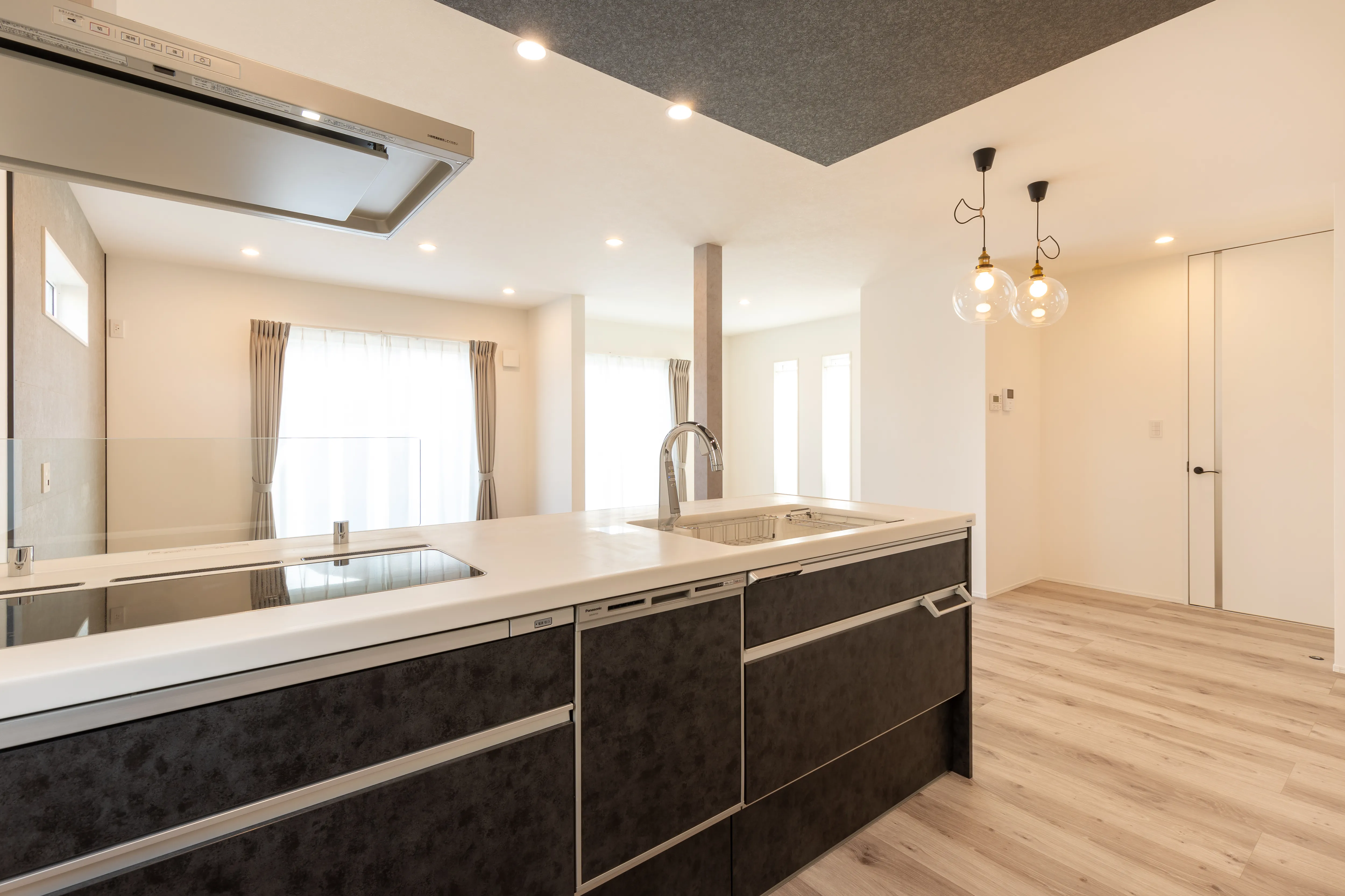 モノトーンのキッチンに上品なペンダントライトがよく似合う